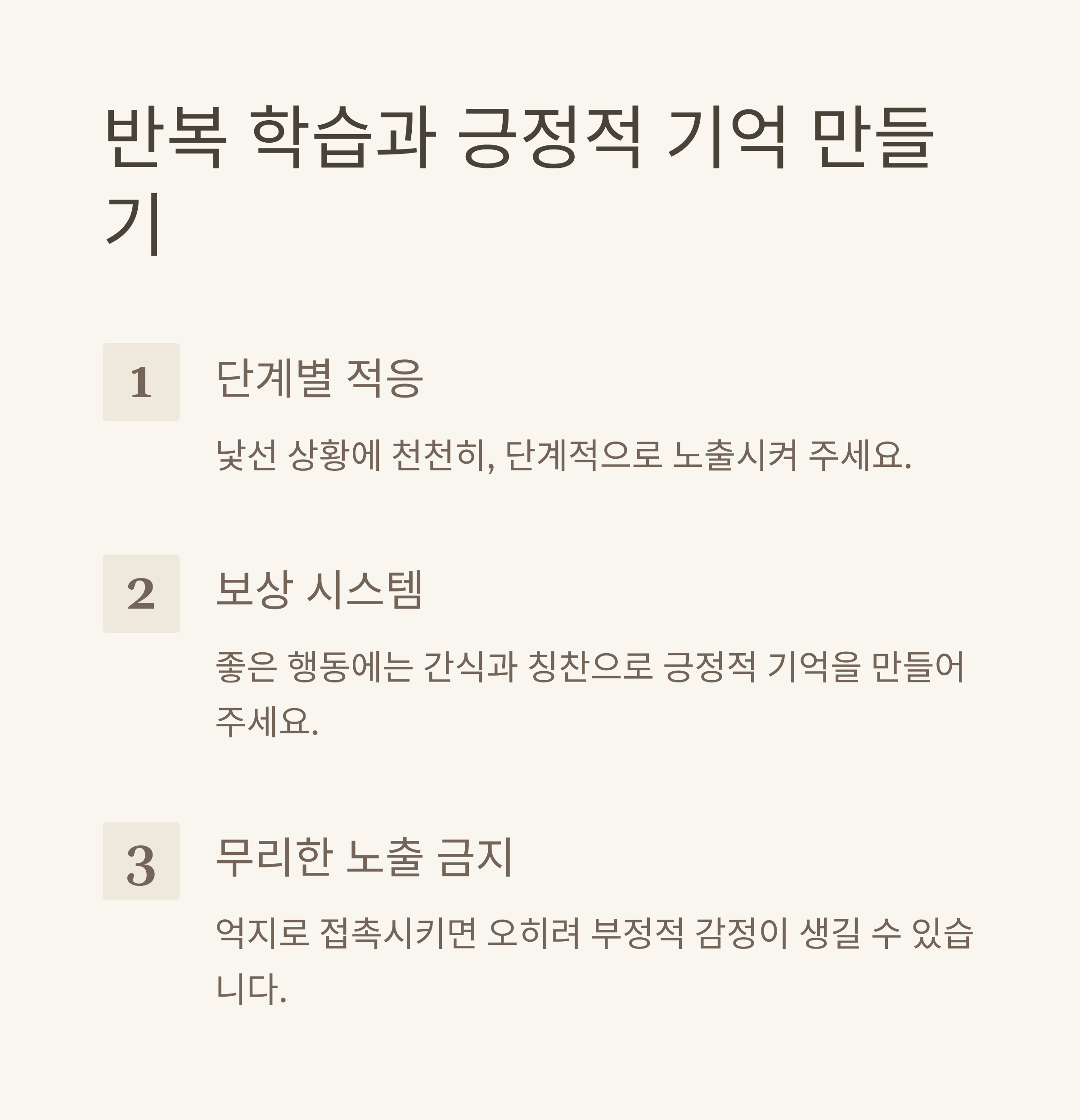 | 다양한 자극에 대한 적응력 키우기 | 일상 속 규칙적인 노출 필요 | 자극 후 보상 훈련 병행 중요 |