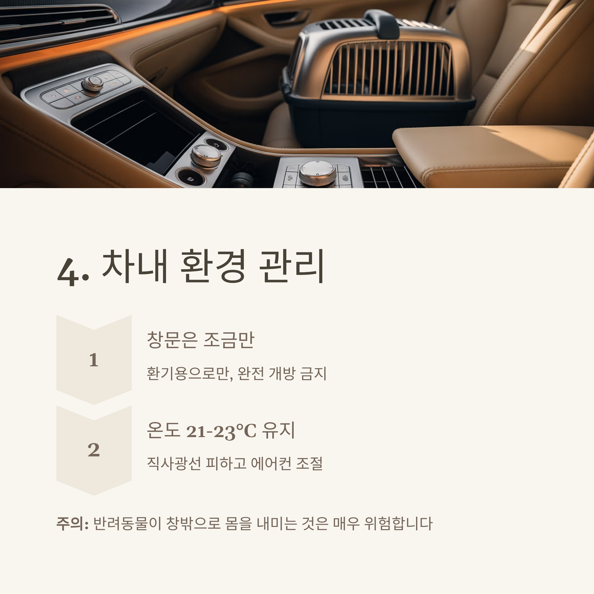 | 이동장 또는 안전벨트 필수 | 사료, 물, 간식, 배변패드 | 정차 및 통풍, 온도조절 |