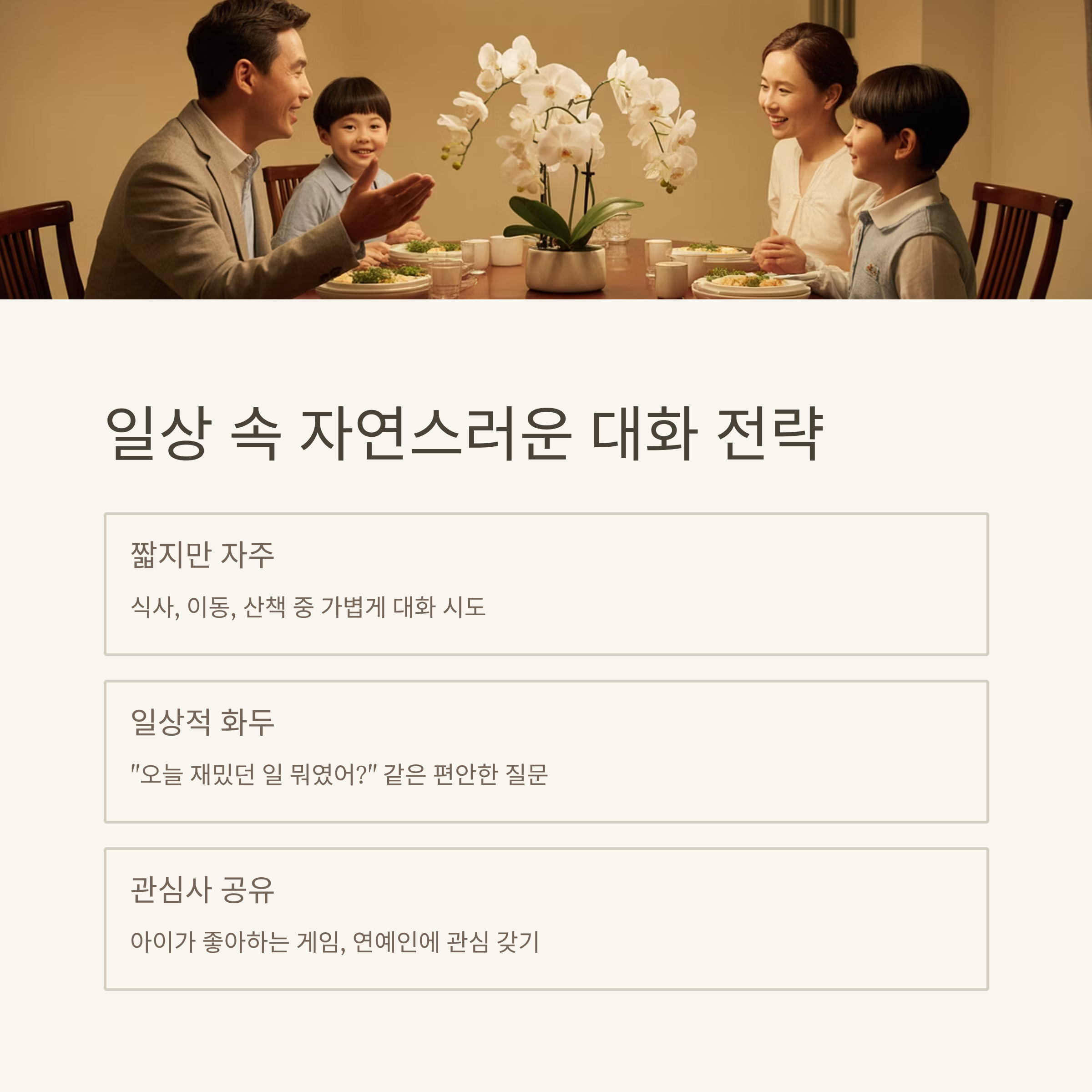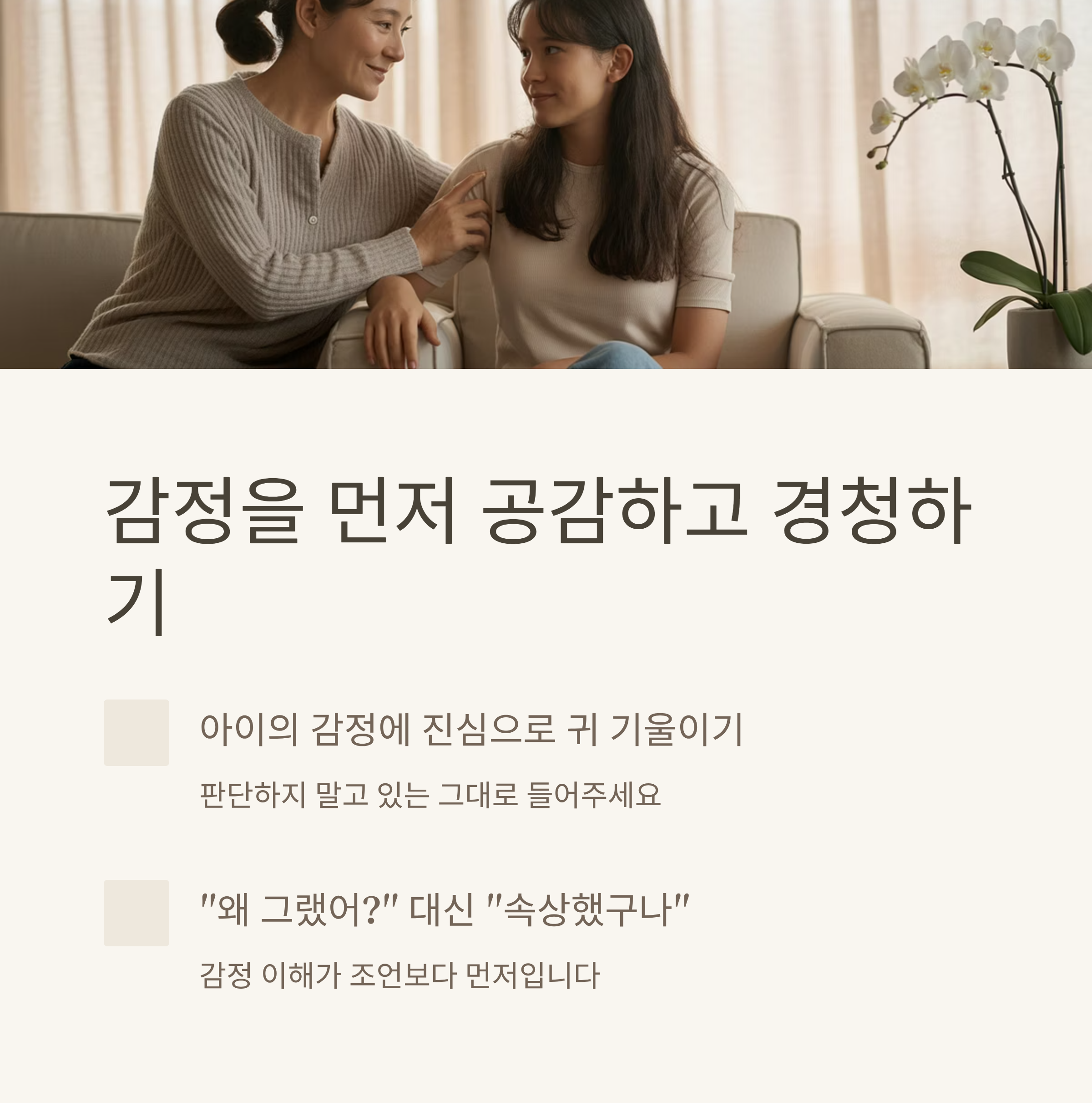 감정을 이해하고 말로 표현해주는 태도 | 아이의 말을 끊지 않고 집중하는 경청 습관 | 일상에서 자연스럽게 대화를 시도하기 |