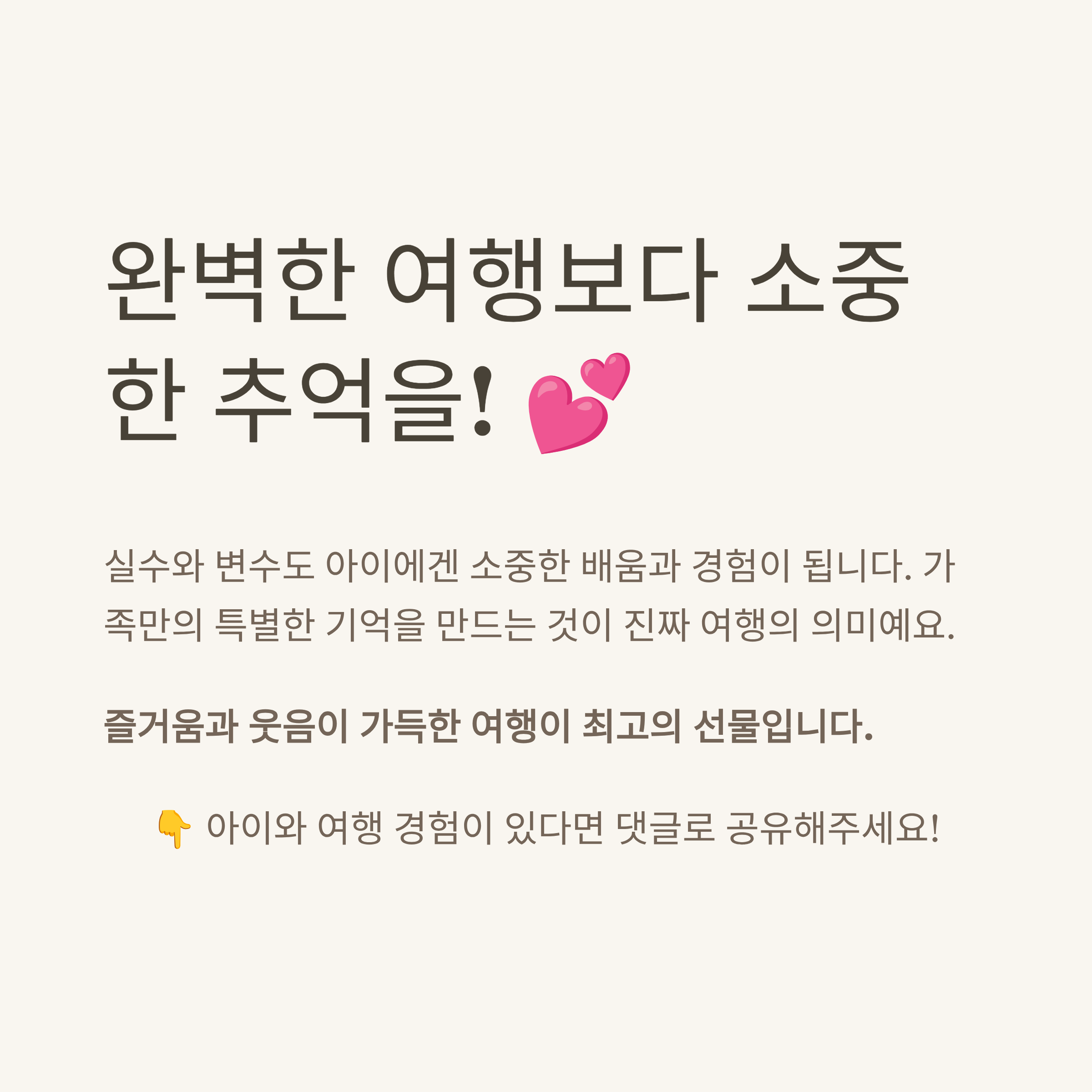 아이와의 여행에서 생긴 에피소드나 도움이 되었던 팁이 있다면 댓글로 남겨주세요. 여러분의 경험이 다른 가족들에게 큰 힘이 됩니다.