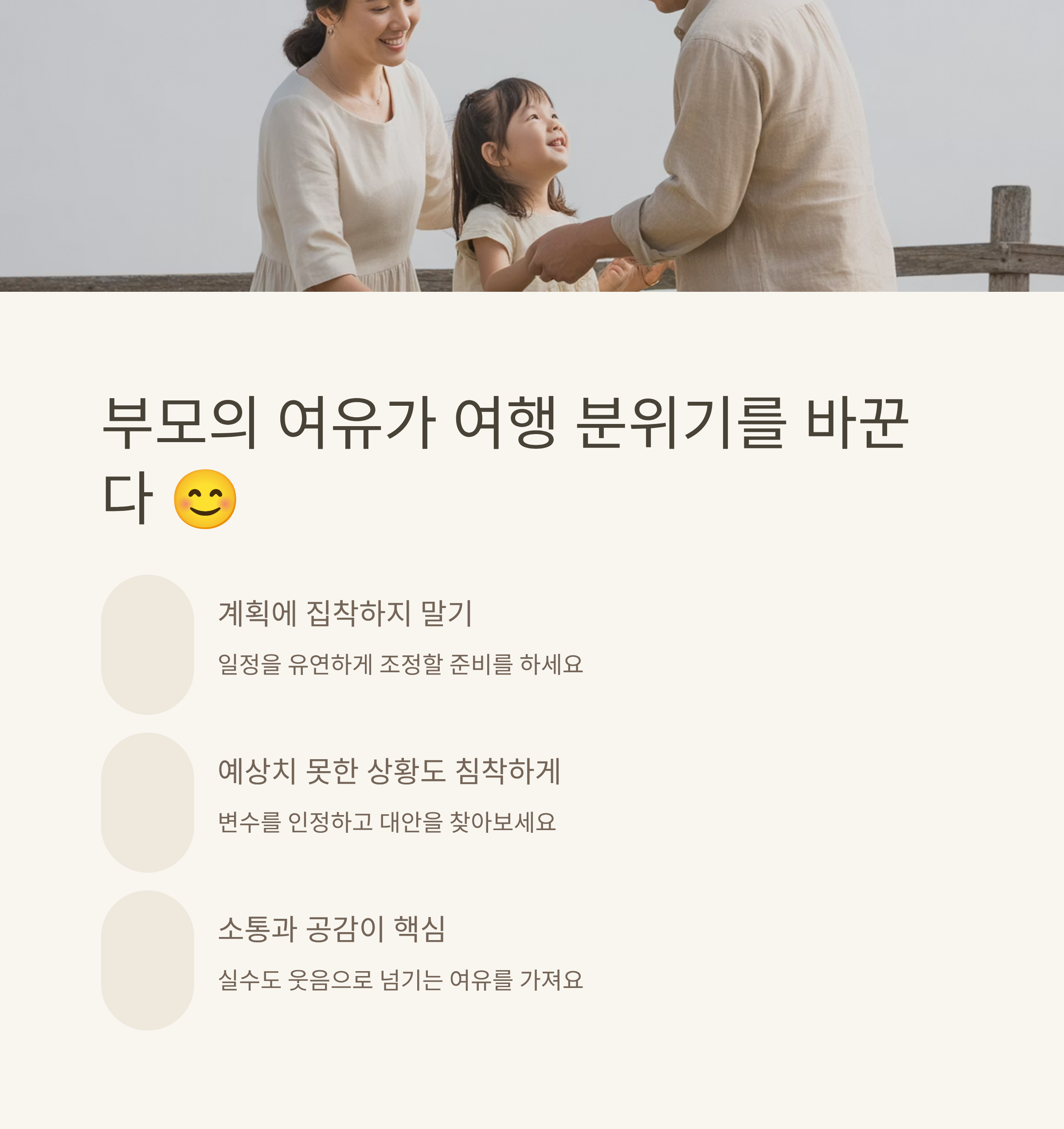 마지막으로 부모의 여유 있는 태도가 가장 중요합니다. 예상과 다른 상황이 생기더라도 당황하기보단 아이와 함께 유연하게 대처하며 분위기를 부드럽게 유지하는 것이 여행의 질을 좌우합니다. 완벽한 여행보다 즐거운 기억을 만드는 것에 집중한다면 아이에게도 최고의 추억으로 남을 수 있습니다.