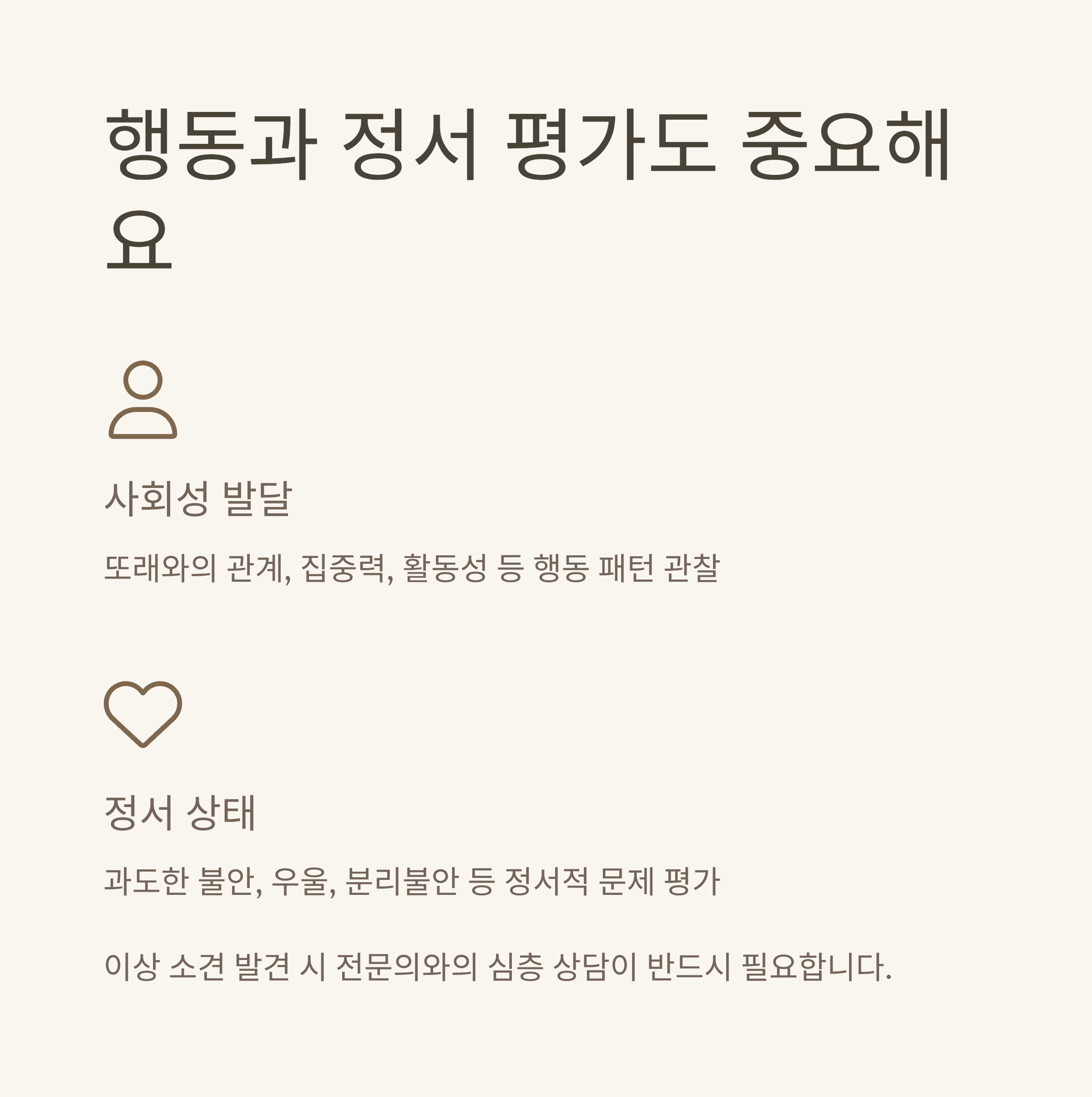 건강검진에서 놓치기 쉬운 항목 중 하나는 '행동발달 평가'입니다. 단순히 키와 몸무게를 확인하는 것이 아니라, 또래와의 상호작용, 언어 사용, 집중력 등 아이의 정서적·사회적 성장도 함께 관찰해야 합니다. 특히 소아 자폐, ADHD 등은 조기에 발견하면 치료와 관리가 훨씬 수월하므로 전문가의 진단과 상담이 중요합니다. 성장곡선 외에도 생활습관과 행동패턴을 종합적으로 살피는 것이 필요합니다.