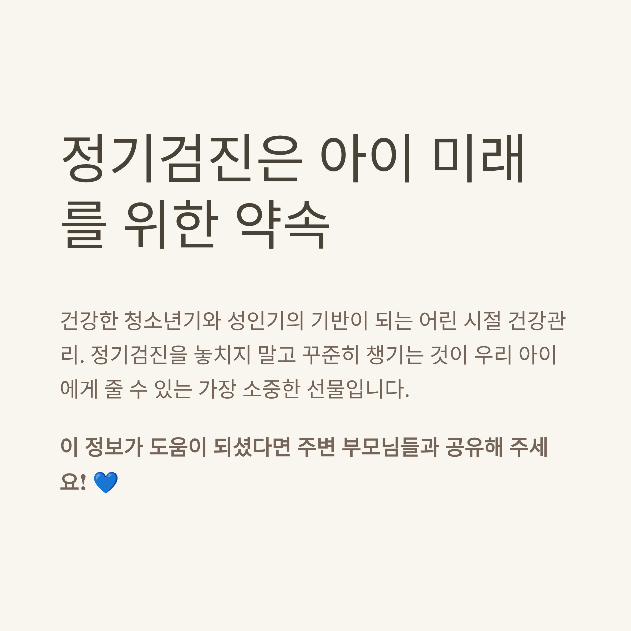 건강검진은 아이의 현재를 이해하고 미래를 준비하는 중요한 수단입니다. 놓치기 쉬운 항목까지 꼼꼼히 확인하고, 검진 결과를 기반으로 일상에서 실천할 수 있는 관리 방법을 찾아야 합니다. 아이는 매일 성장하며 변화하기에 정기적인 확인과 부모의 관심이 절대적으로 필요합니다. 이번 포스팅이 아이의 건강을 위한 첫 걸음에 도움이 되었기를 바랍니다.