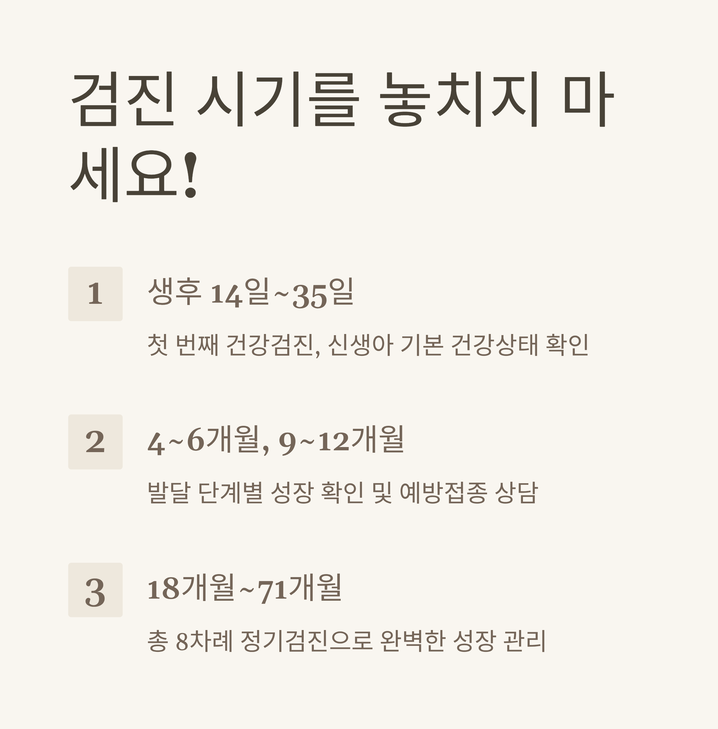 건강검진 시기 생후 14세까지 총 7회의 검진이 권장됩니다.