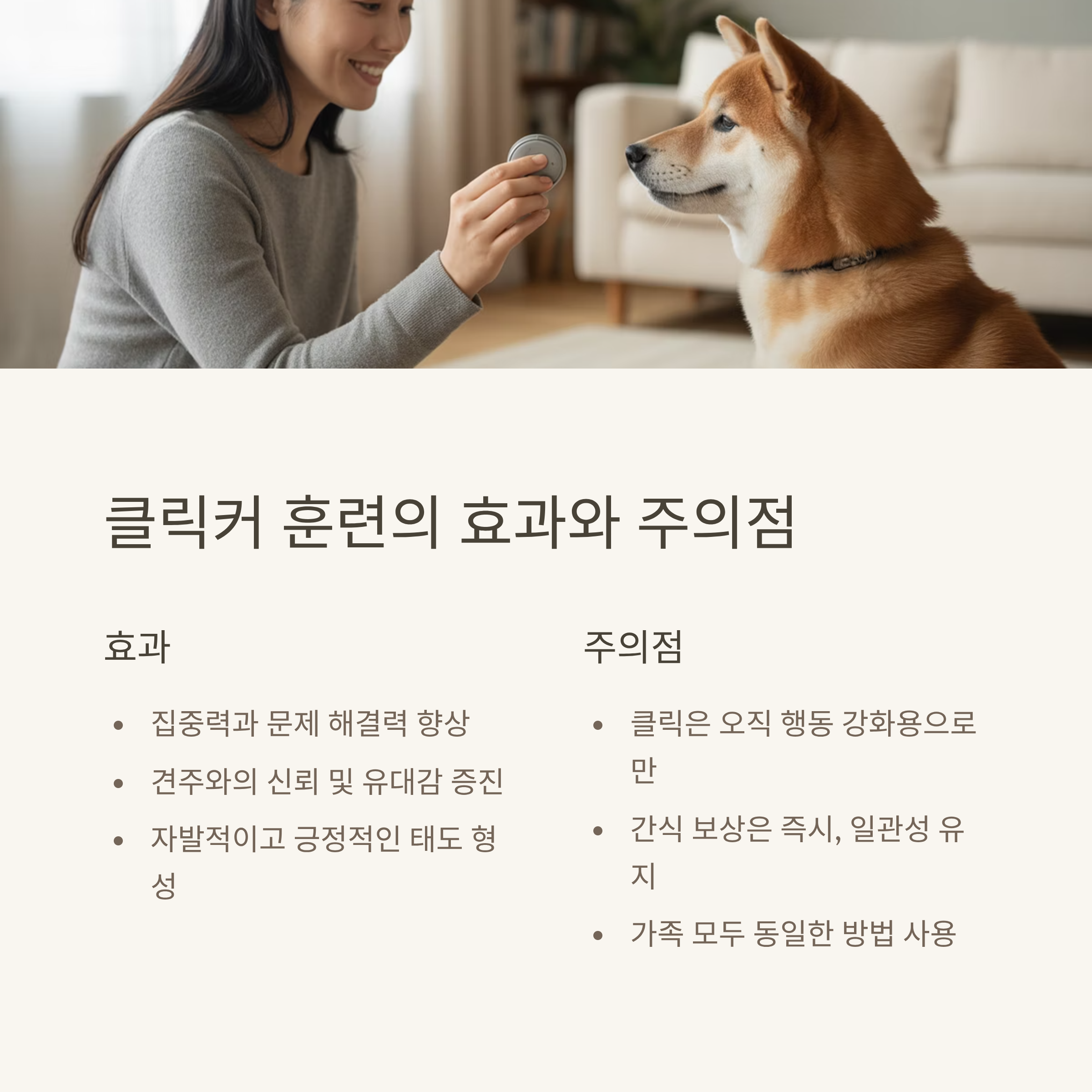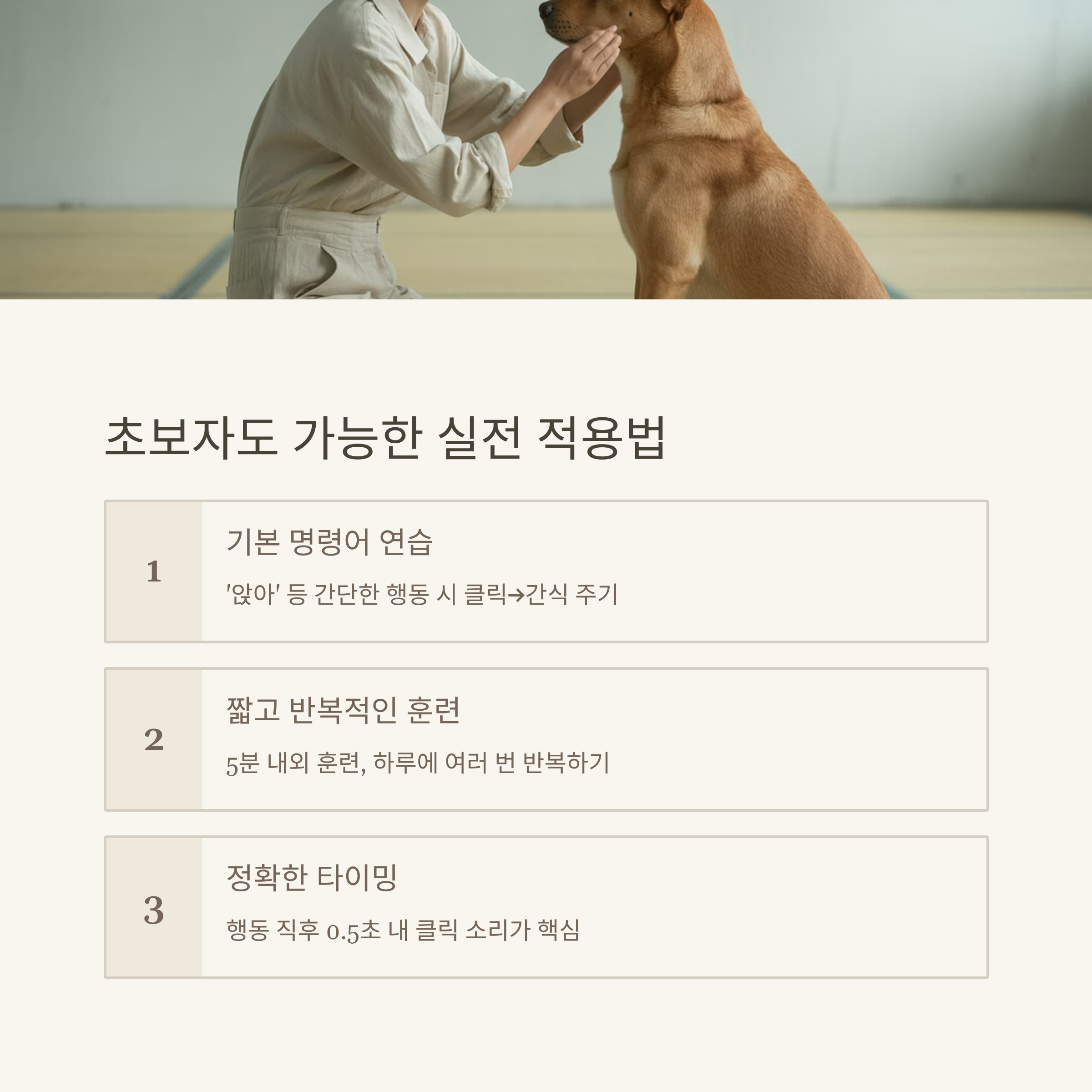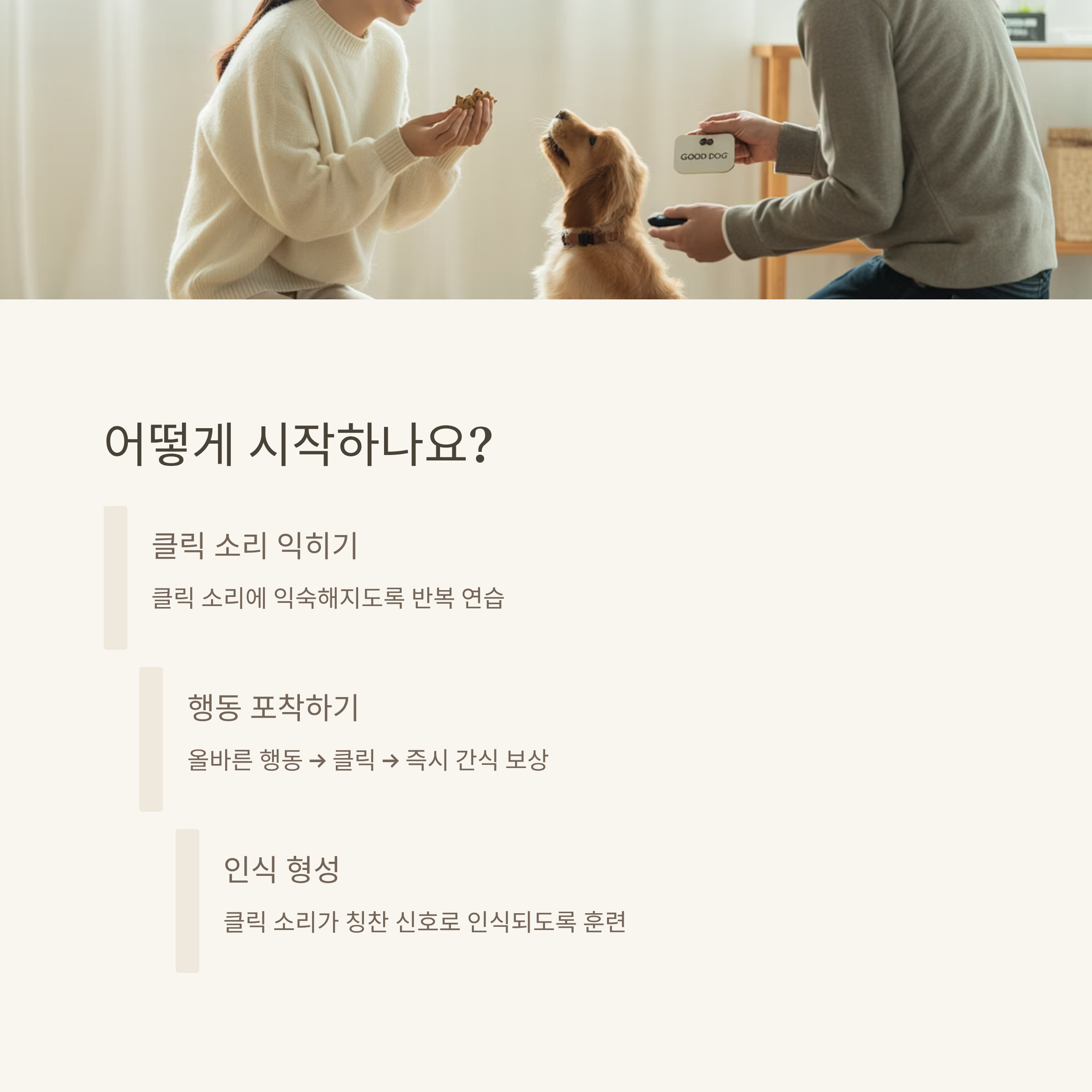 | 클릭커 훈련이란? | 소리로 보상 타이밍을 알려주는 훈련 방식입니다. |