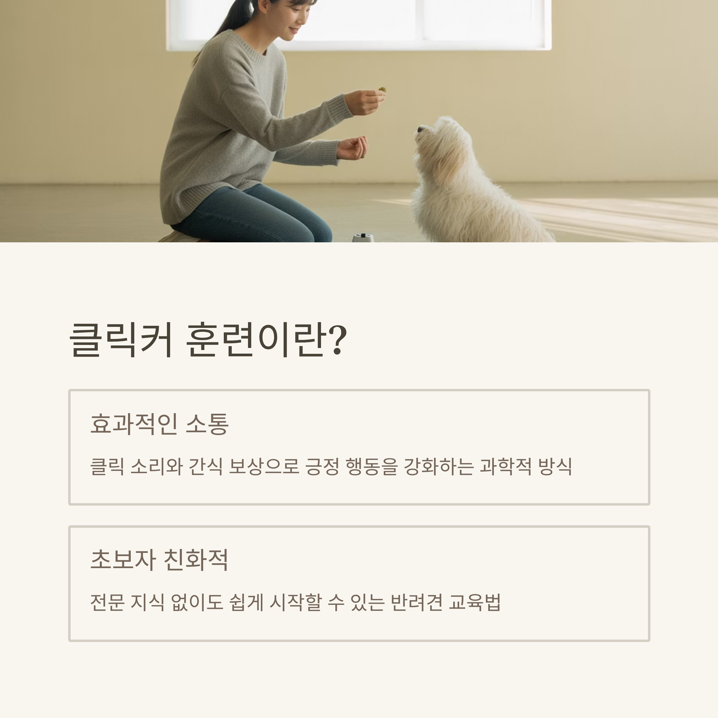 클릭커 훈련이란? | 소리로 보상 타이밍을 알려주는 훈련 방식입니다. |