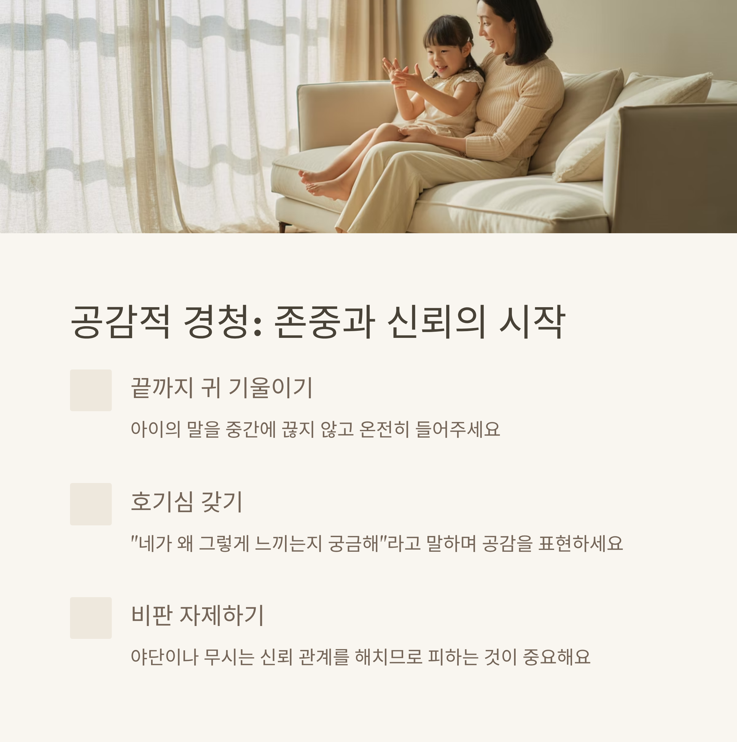두 번째는 공감적 경청입니다. 아이가 이야기할 때 말 끊지 않기, 고개 끄덕이며 눈 맞추기, “응, 계속 이야기해줘”처럼 반응하기 등 적극적인 경청 태도가 필요합니다. 이는 아이가 “나는 존중받고 있어”라고 느끼게 해줍니다. 공감은 말보다 태도로 전해진다는 점을 기억하세요.