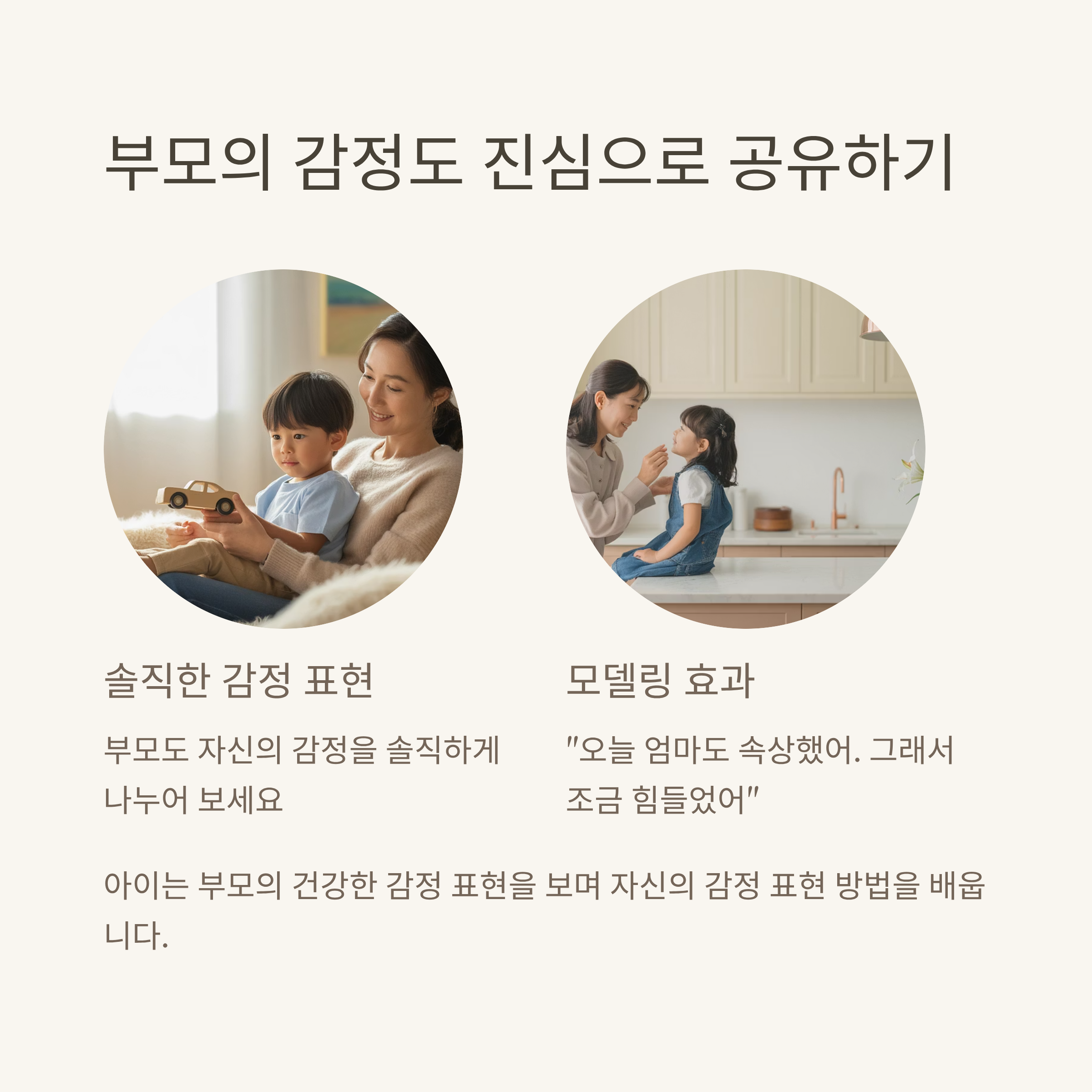 마지막 세 번째는 감정 공유하기입니다. “엄마도 그런 기분 느껴봤어”, “나도 그럴 때 있었어” 이런 표현은 아이에게 감정이 통하는 경험을 줍니다. 단, 이야기를 빼앗지 말고 ‘함께 느낀다’는 메시지가 전달되도록 해야 합니다. 부모의 진심 어린 감정 공유는 아이에게 깊은 안정감을 줍니다.