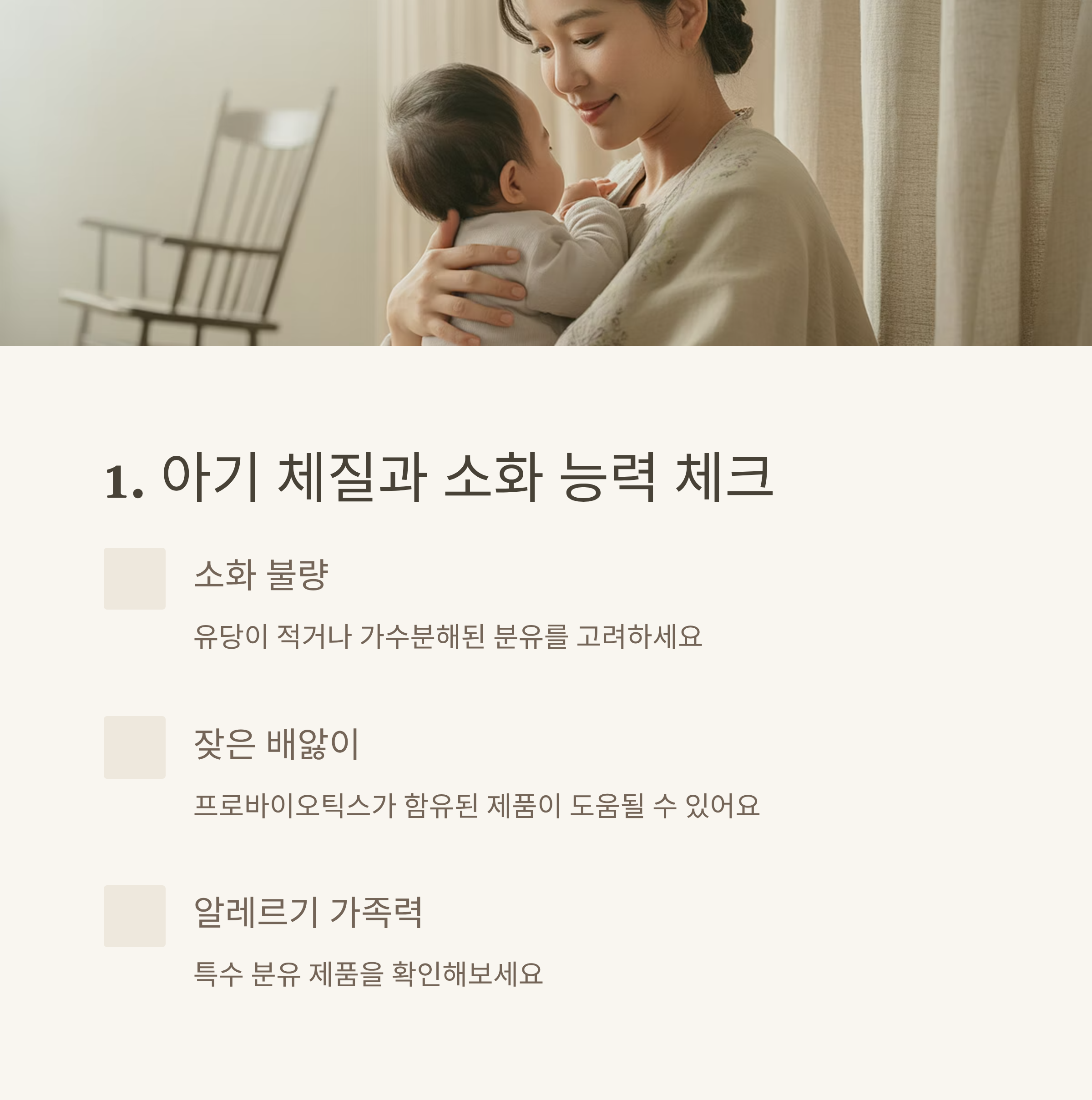 | 단백질, 유당, 지방산, 비타민 등 구성 체크 | 국산과 수입 제품의 단가 및 용량 비교 | 소화력, 알레르기, 체질별 선택법 설명 |