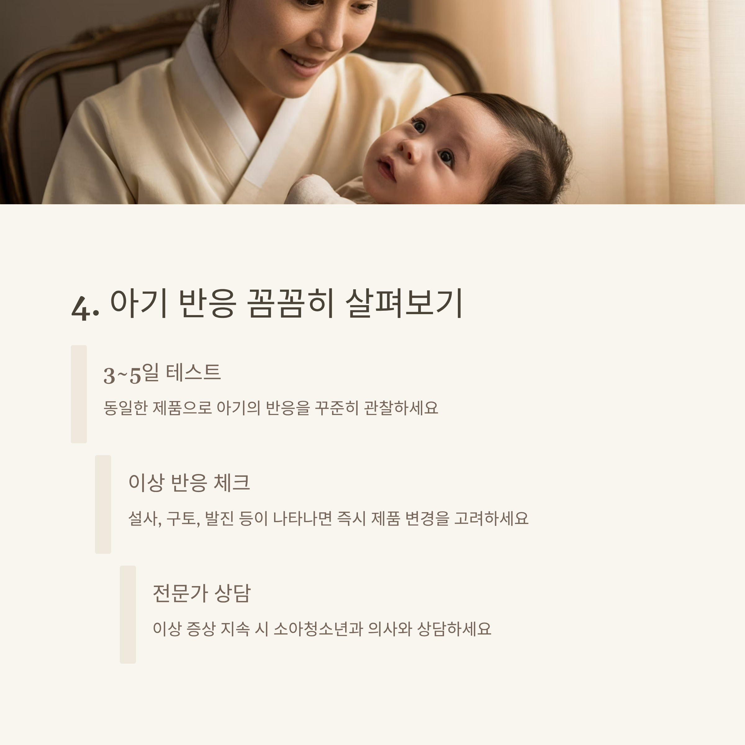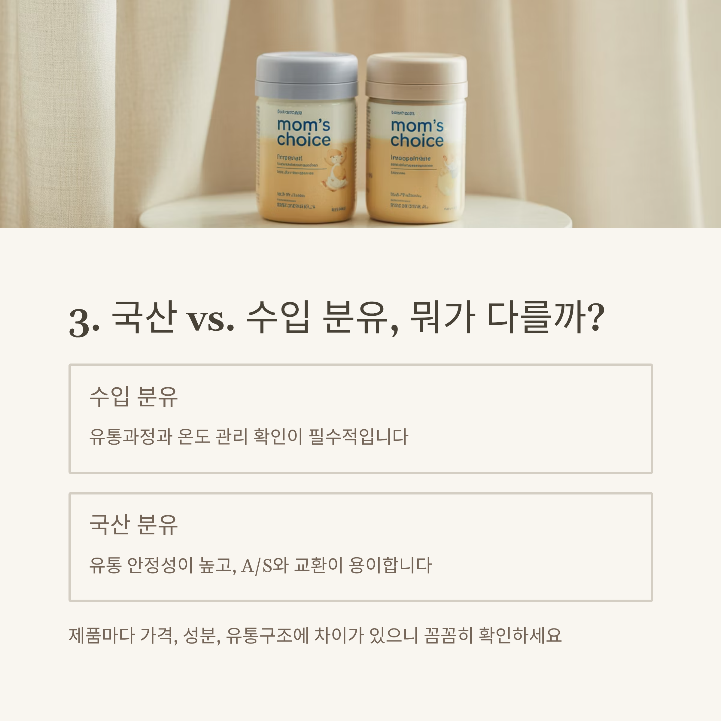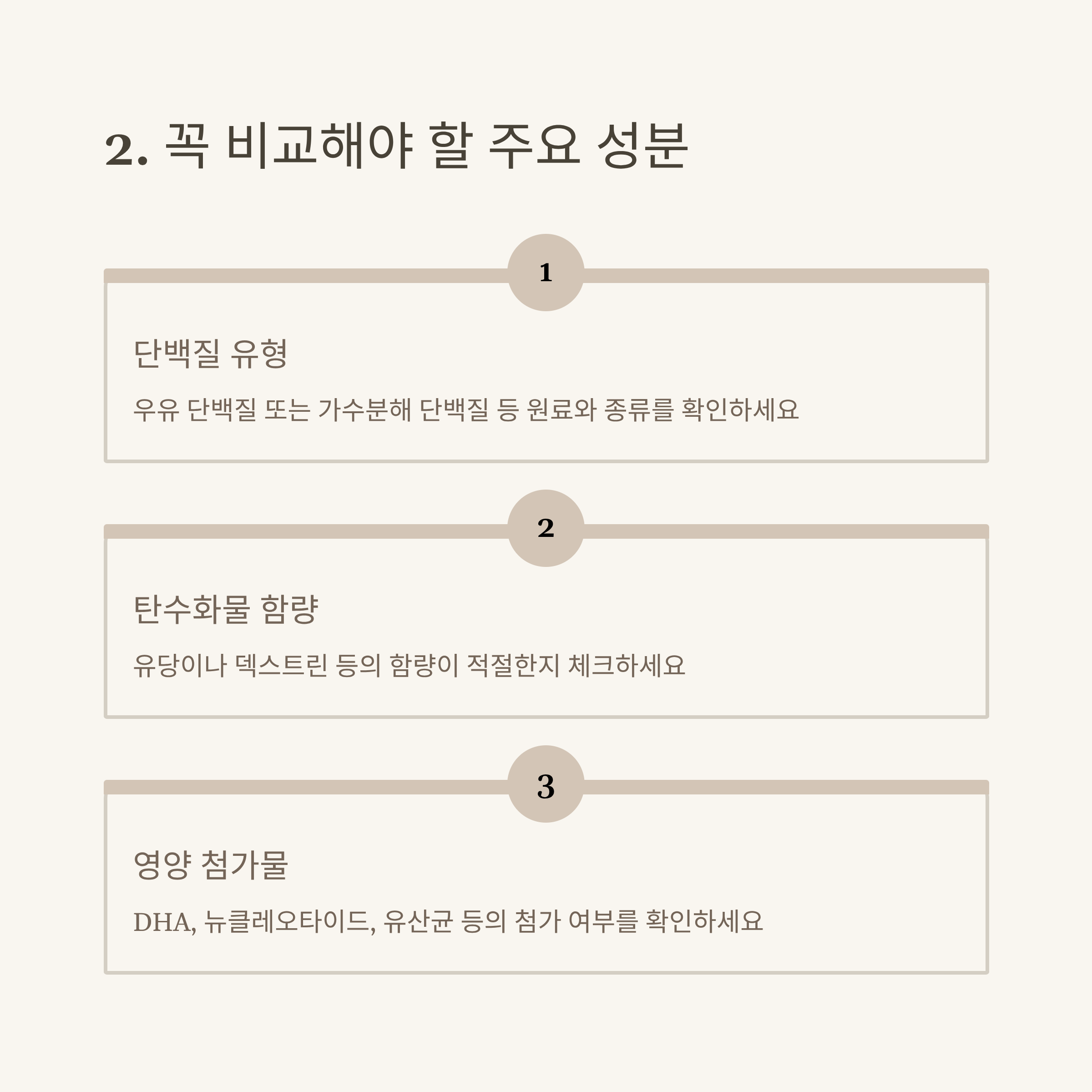 | 단백질, 유당, 지방산, 비타민 등 구성 체크 | 국산과 수입 제품의 단가 및 용량 비교 | 소화력, 알레르기, 체질별 선택법 설명 |