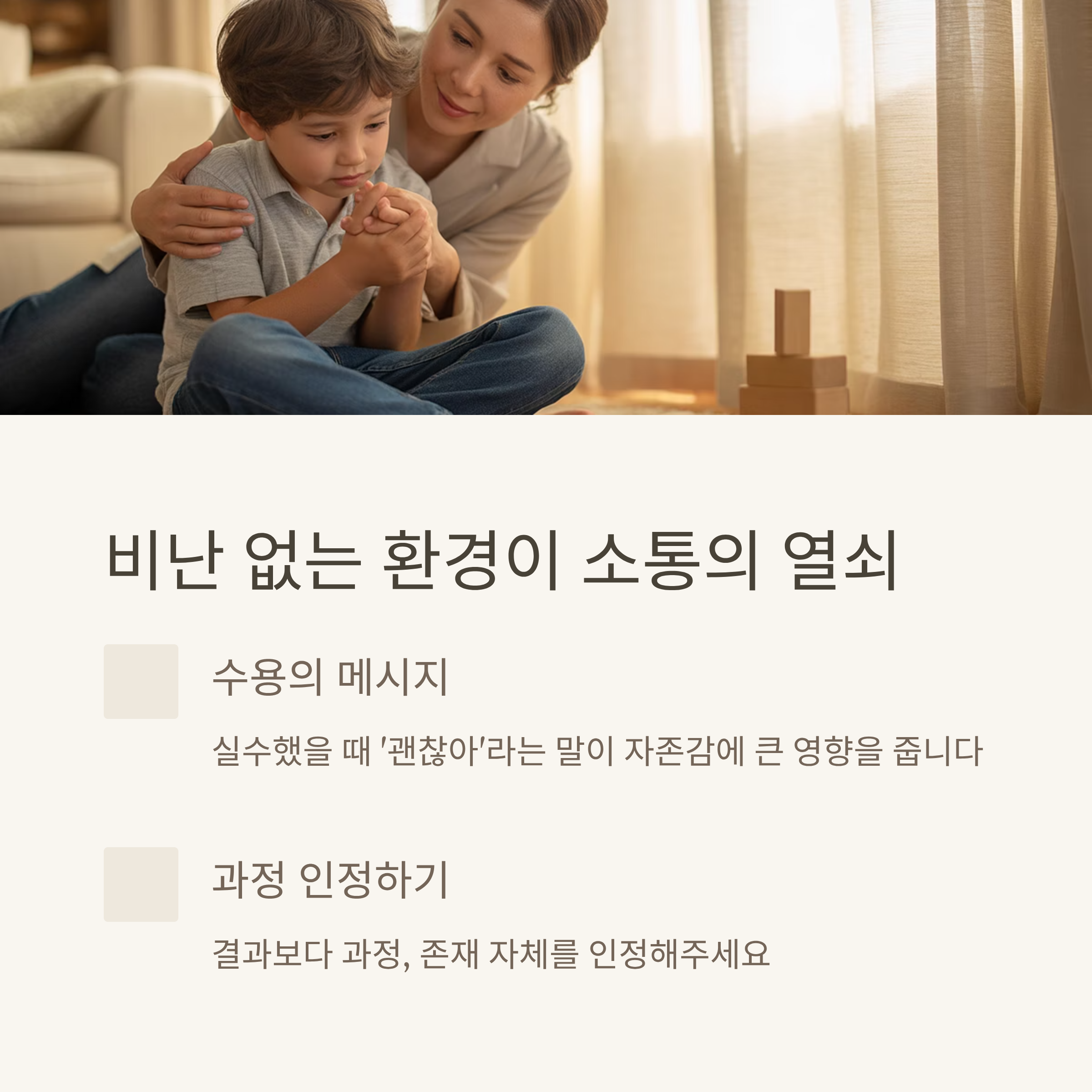 경청의 기술은 훈련을 통해 더욱 향상될 수 있습니다. 아이가 이야기할 때 중간에 끼어들거나 해결책을 제시하는 대신, 끝까지 들어주는 태도를 가져야 합니다. 또한 “그건 네가 잘못했어”가 아닌 “그 상황이 속상했겠구나”라고 반응하는 것이 공감적 경청의 핵심입니다. 이렇게 말투를 바꾸는 것만으로도 아이는 비난받지 않고 이해받는다고 느끼게 되며, 감정을 숨기지 않고 말하는 습관이 자리잡습니다.