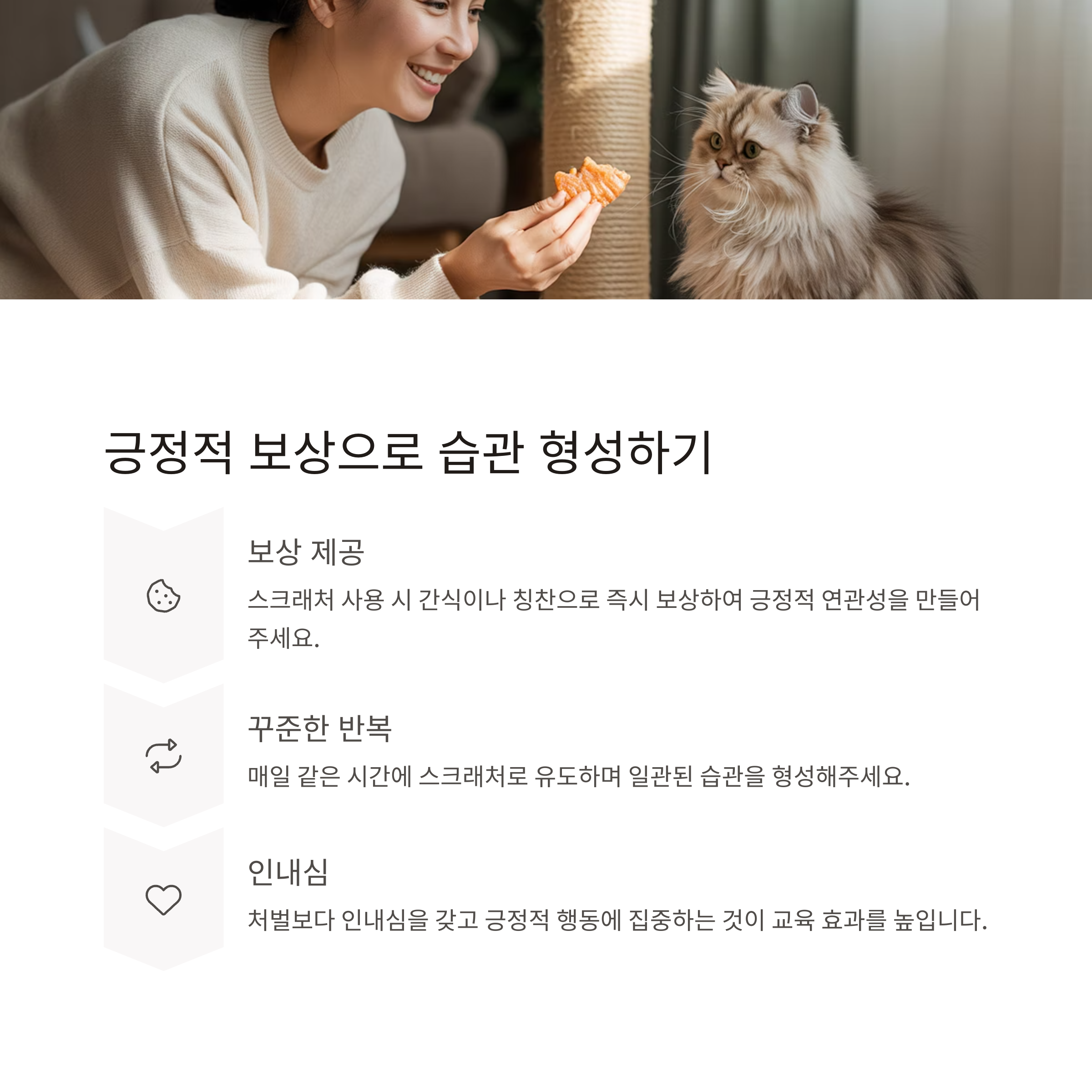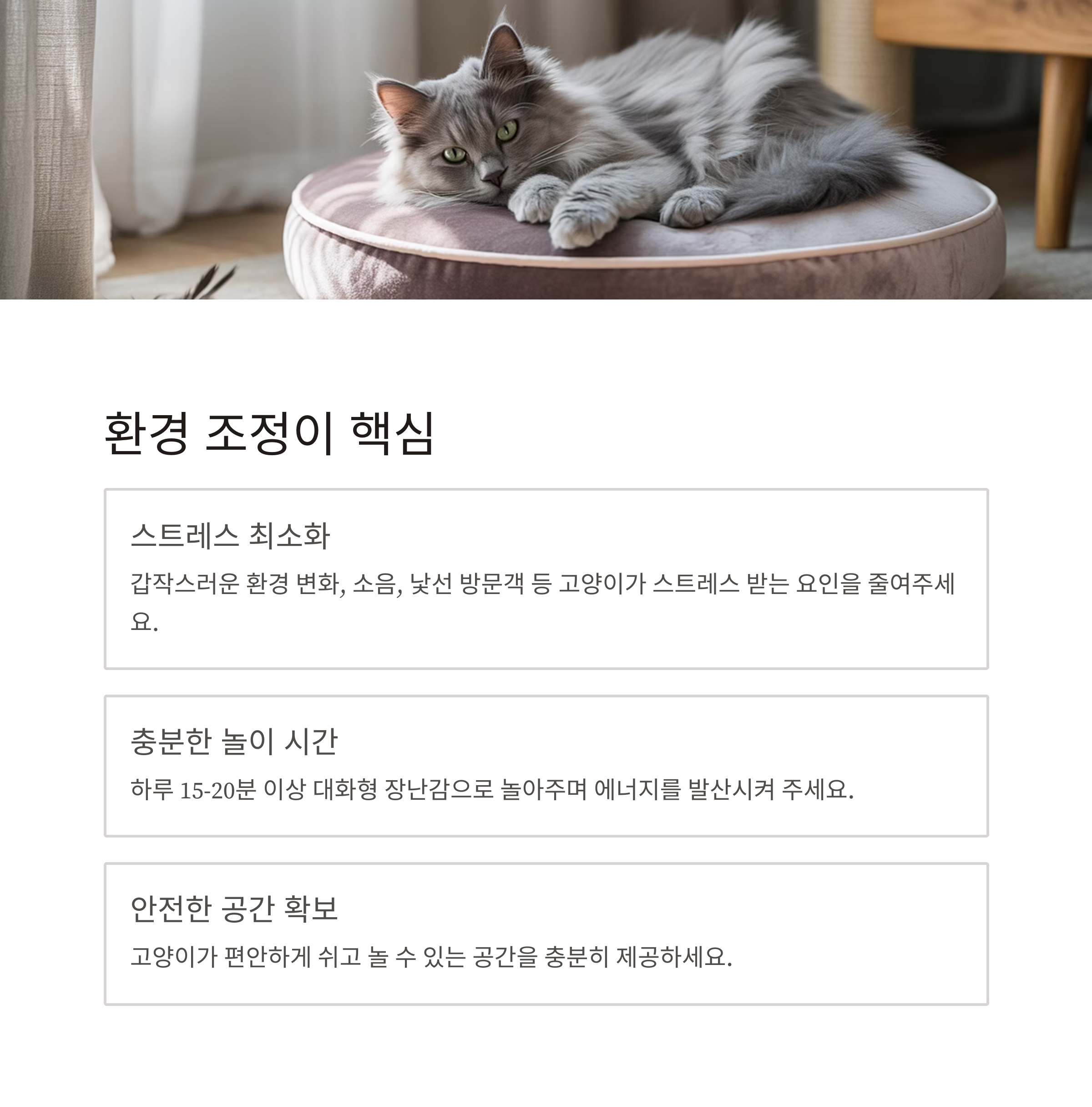 | 혼내기보다 환경 조절이 더 효과적 | 고양이 취향을 반영한 선택 필요 | 일관된 대응이 장기적 습관 형성에 도움 |