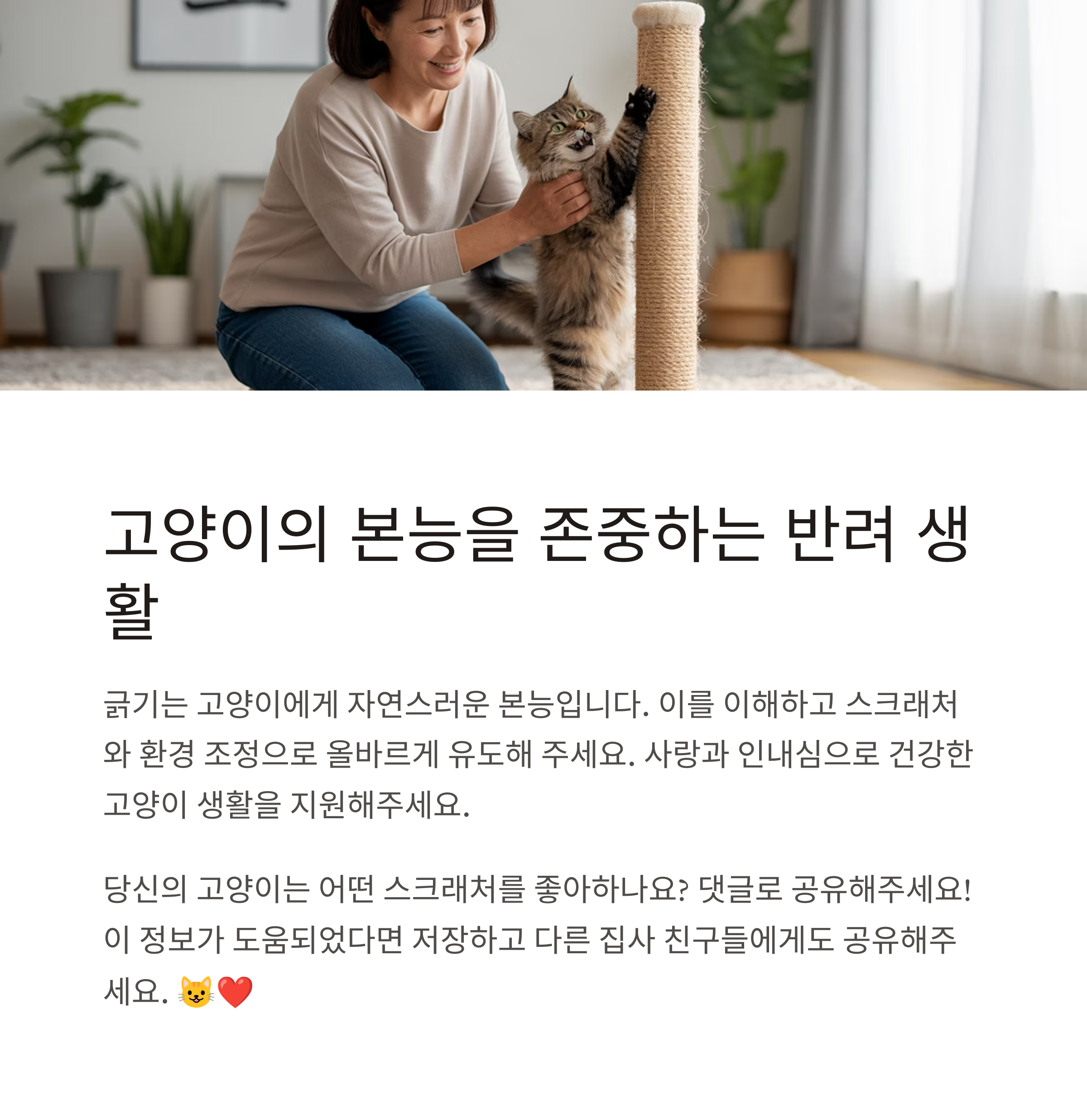 고양이의 긁기 행동에 대해 고민하고 계신가요? 여러분의 해결 경험이나 효과적인 팁을 댓글로 공유해 주세요. 다른 집사들에게도 큰 도움이 될 수 있습니다!