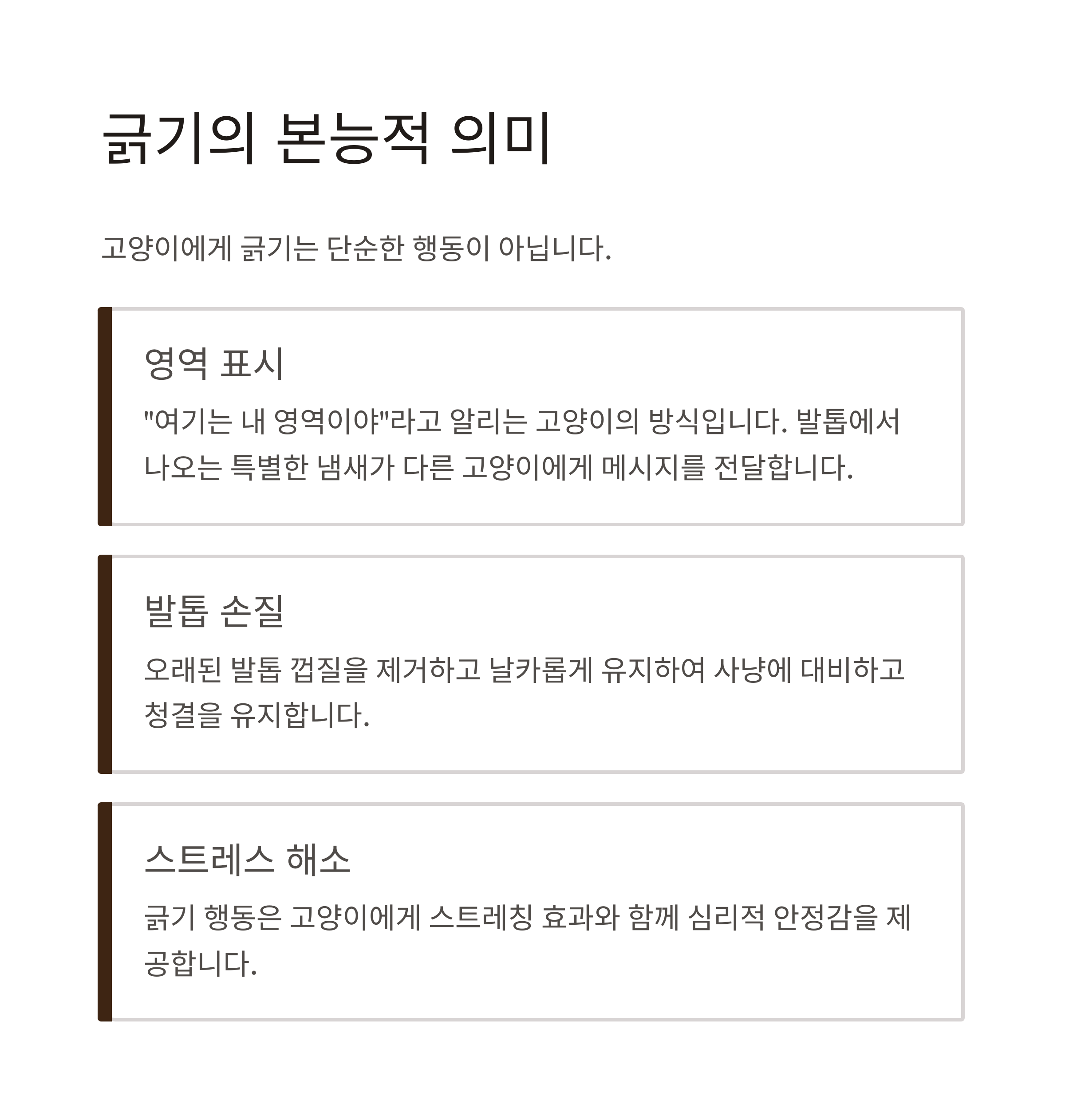 | 고양이 긁기 이유 | 스트레스 해소, 영역 표시, 발톱 손질 등이 목적입니다. |