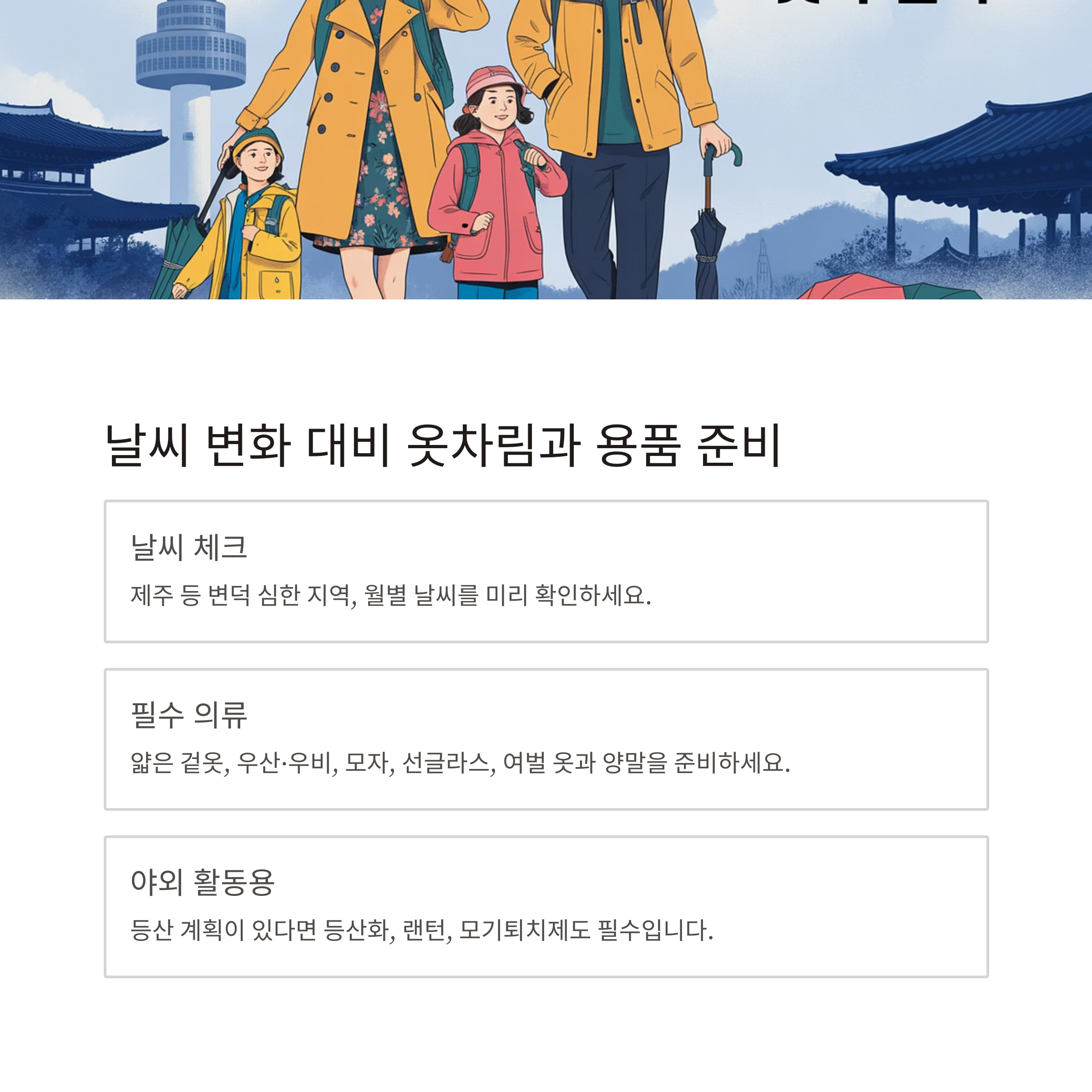 여벌 옷, 간식, 방수팩, 손 세정제 등 | 체크리스트를 출력해 눈에 잘 보이게 두기 | 출발 하루 전 최종 정리로 빠진 물건 없는지 확인 |