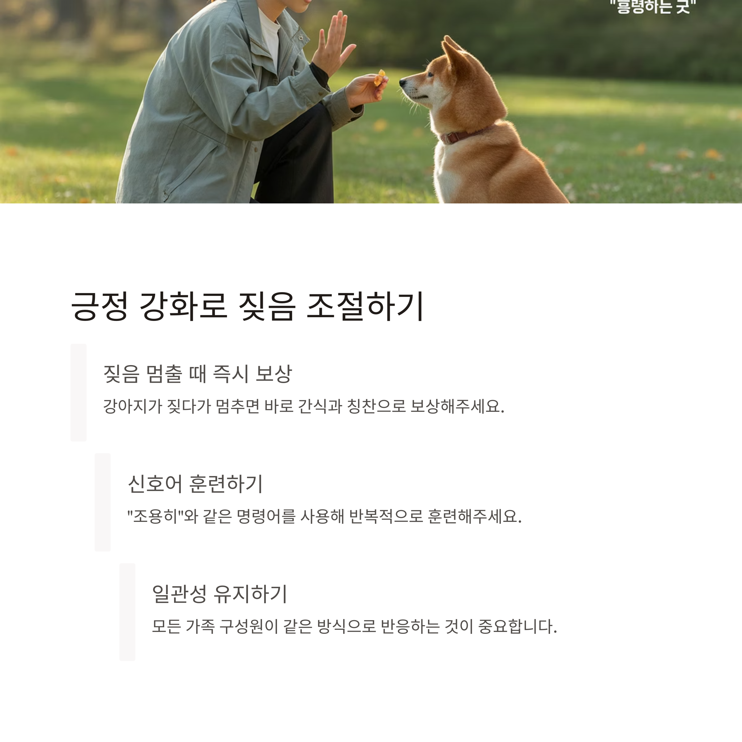 강아지의 짖음은 단순한 소음이 아니라 그들의 감정 표현입니다. 우리가 이해하고 존중하는 자세로 접근한다면, 훈련은 더 수월해집니다. 짖는 행동을 꾸짖기보다는 침착한 태도와 보상을 통해 조절할 수 있도록 도와주는 것이 핵심입니다. 오늘 소개한 훈련법은 실생활에서도 바로 적용할 수 있으며, 반려견의 스트레스를 줄이고 보호자와의 유대감을 더욱 깊게 만들어줄 것입니다. 강아지와의 소통, 오늘부터 시작해보세요!