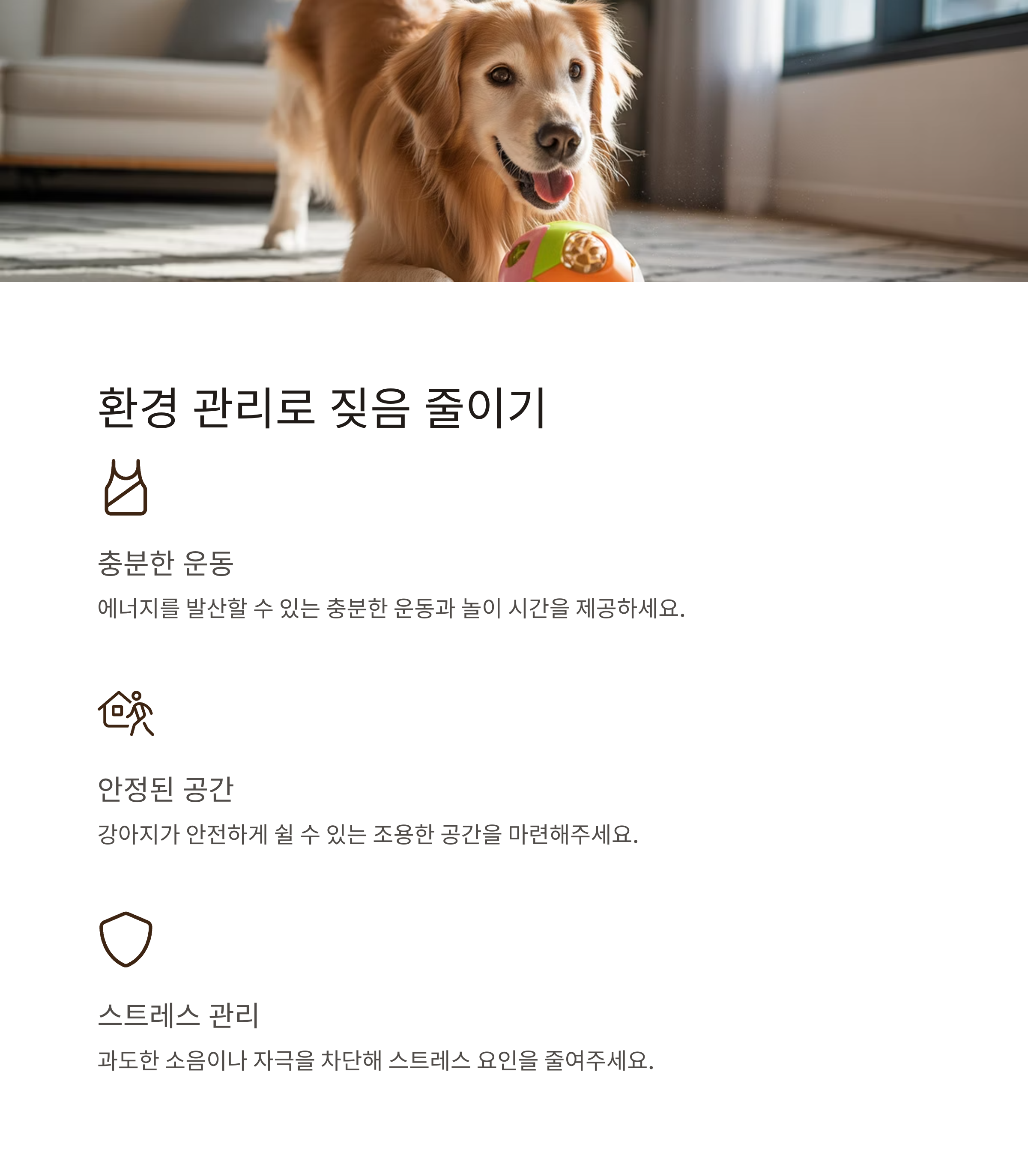 | 자극 요인 파악이 먼저예요 | 조용함을 보상으로 학습시켜요 | 에너지 발산과 관심이 필요해요 |