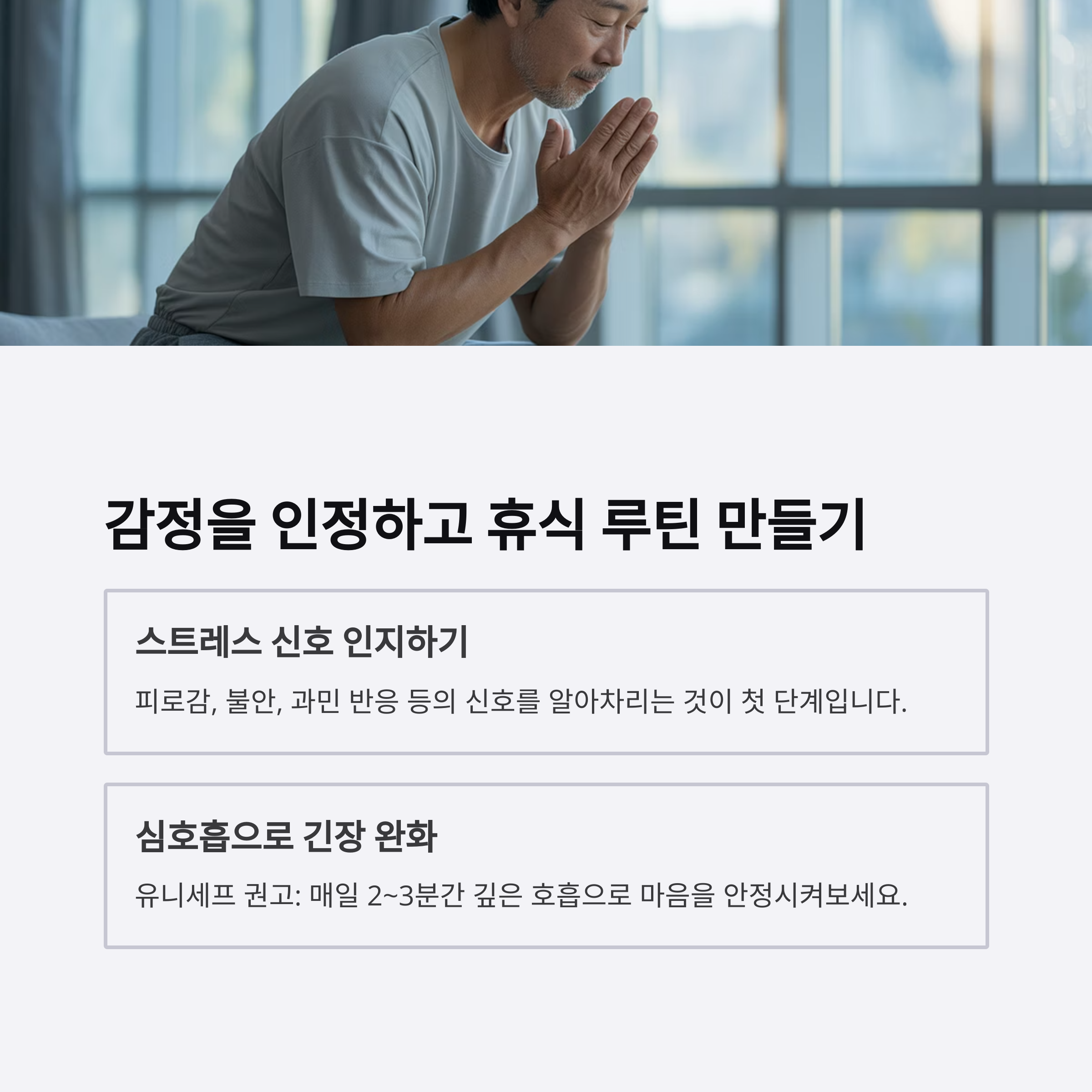 바쁜 상황에서도 5~10분 정도 짧은 쉼을 의식적으로 만들고, 호흡이나 명상으로 감정을 정리하는 것만으로도 큰 효과가 있습니다.