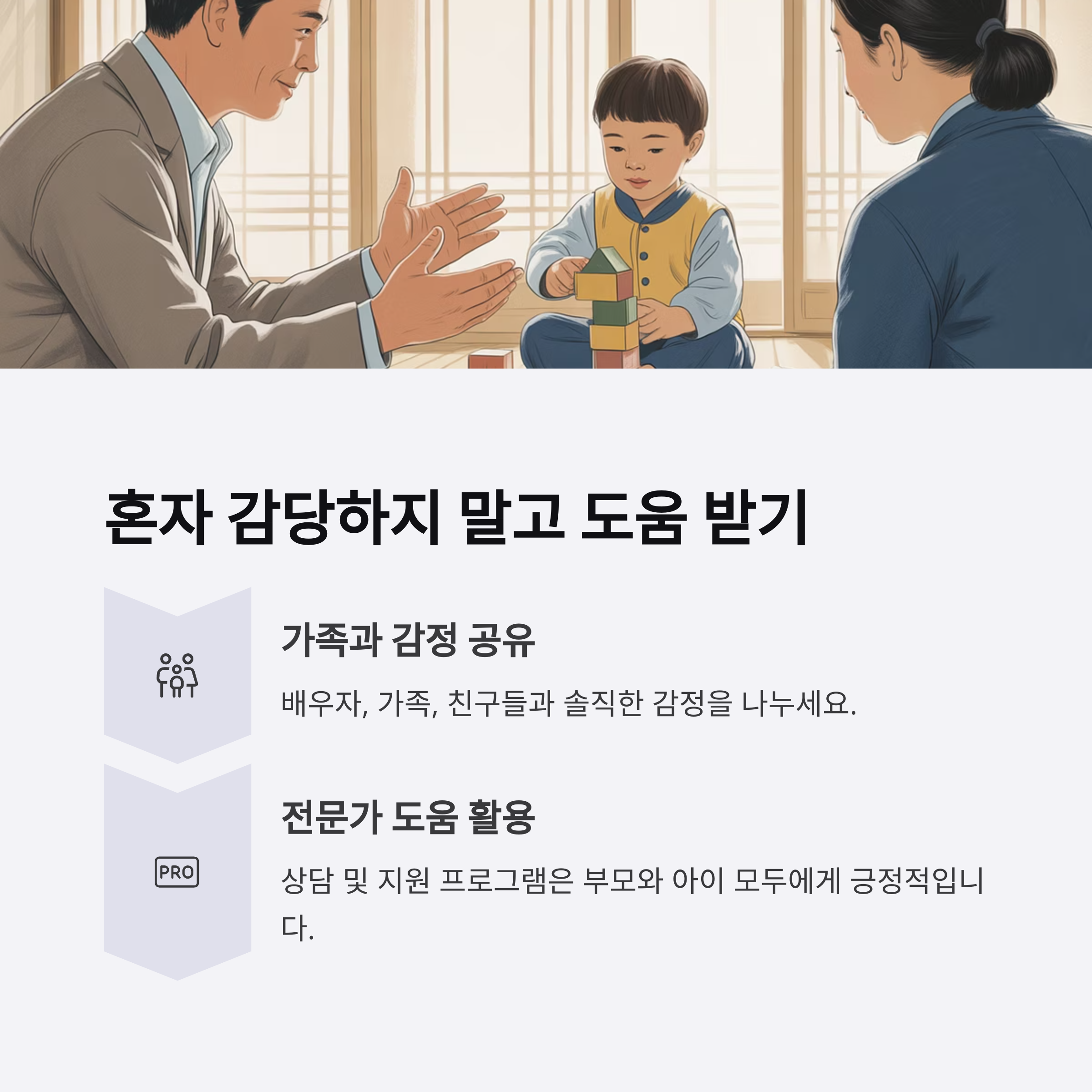 멘탈을 지키는 다섯 가지 팁은 이렇습니다. 첫째, 혼자서 다 하려 하지 않기, 둘째, 작은 휴식이라도 스스로에게 허락하기, 셋째, 완벽하지 않아도 괜찮다고 말해주기, 넷째, 다른 부모와 경험을 공유하기, 마지막으로 심리상담 등 전문가의 도움을 주저하지 않기. 내가 안정되어야 아이도 건강하게 자랄 수 있음을 잊지 마세요.