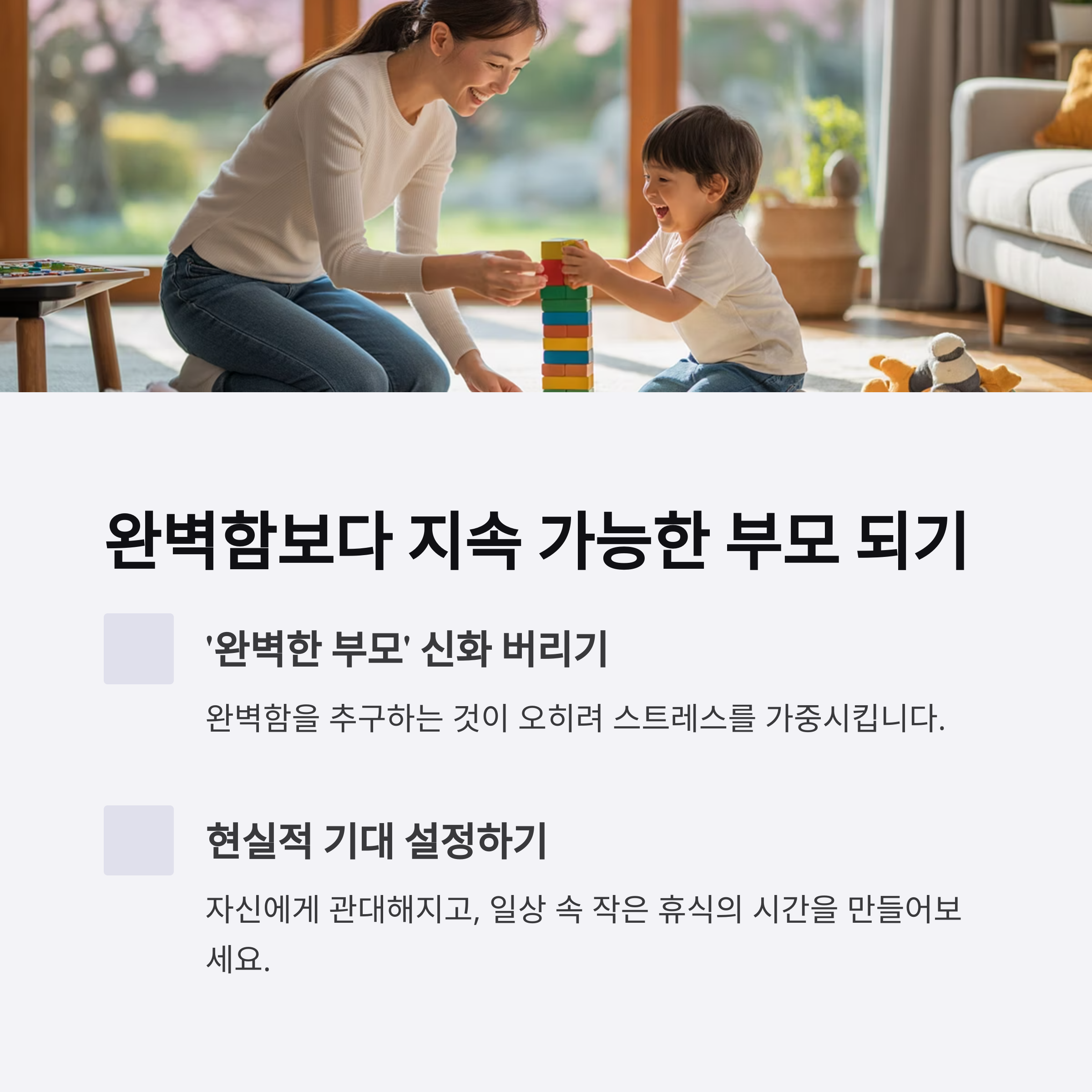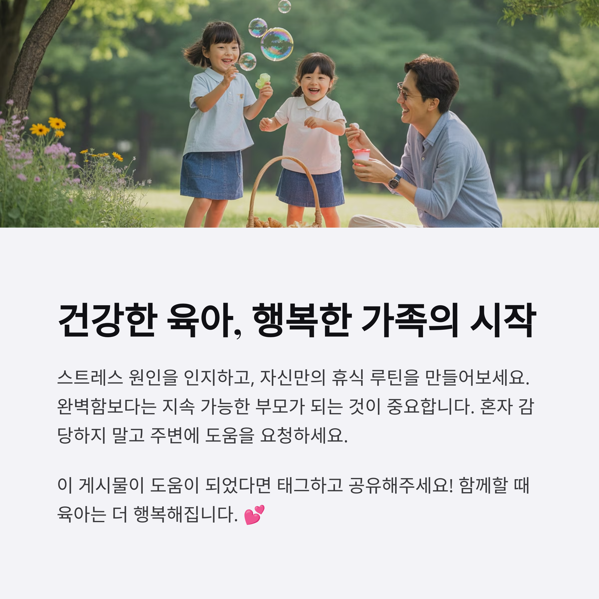 육아는 감정적으로도 체력적으로도 소모가 큰 여정입니다. 그렇기 때문에 부모가 자신의 상태를 점검하고 건강하게 유지하는 것이 가장 중요한 첫걸음입니다. 때로는 내려놓고, 때로는 도움을 구하며, 나 자신을 돌보는 시간을 가져야 합니다. 완벽한 부모가 되기보다, 지속 가능한 부모가 되는 것, 그것이야말로 아이에게 주는 가장 큰 선물일 것입니다. 이 글이 여러분의 마음에 작은 여유를 안겨드리길 바랍니다.