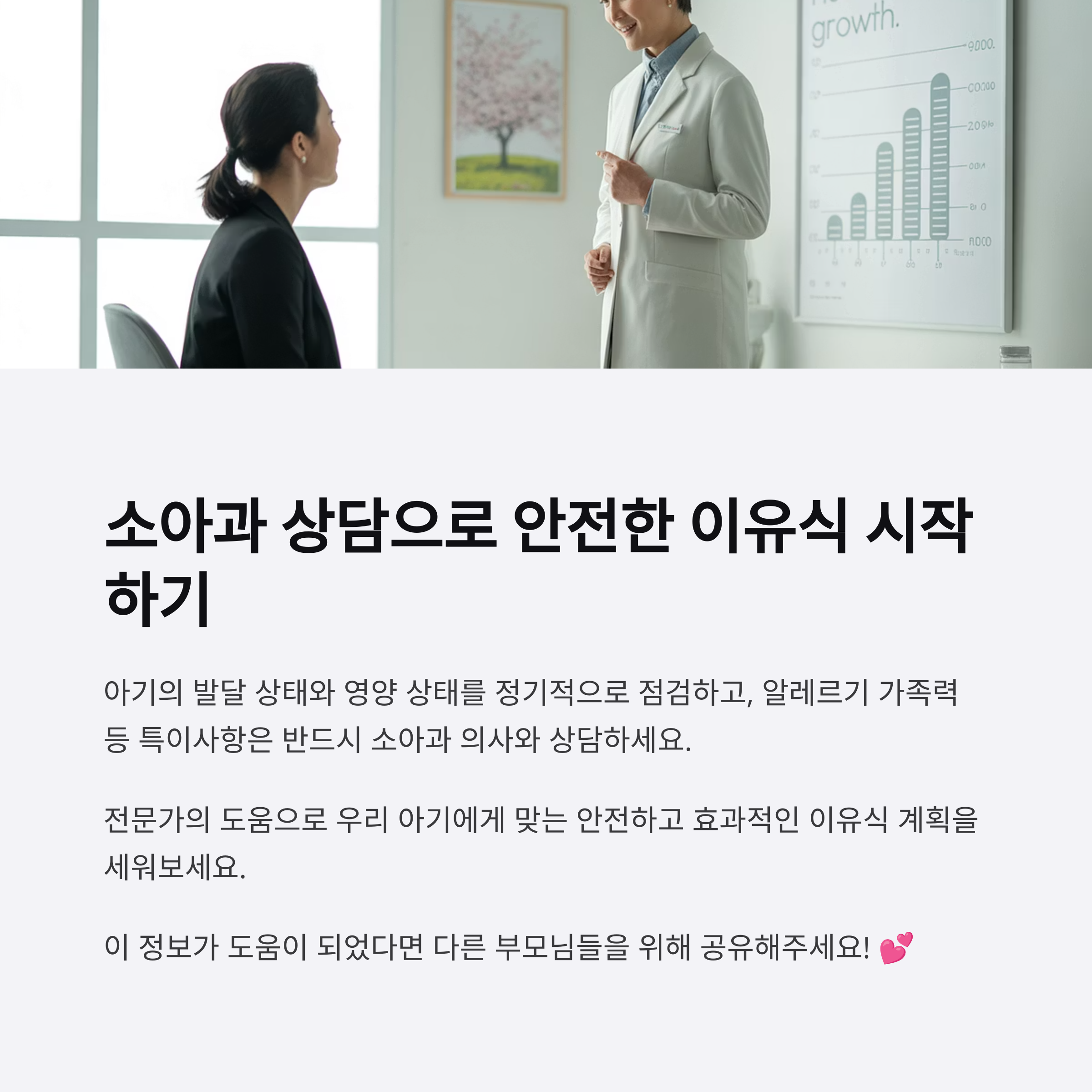 소아과 전문의의 진단을 통해 철분 상태, 체중 증가, 알레르기 위험 등을 파악할 수 있어요. 전문 상담은 더욱 안전하고 맞춤형 이유식 시작을 도와줍니다.