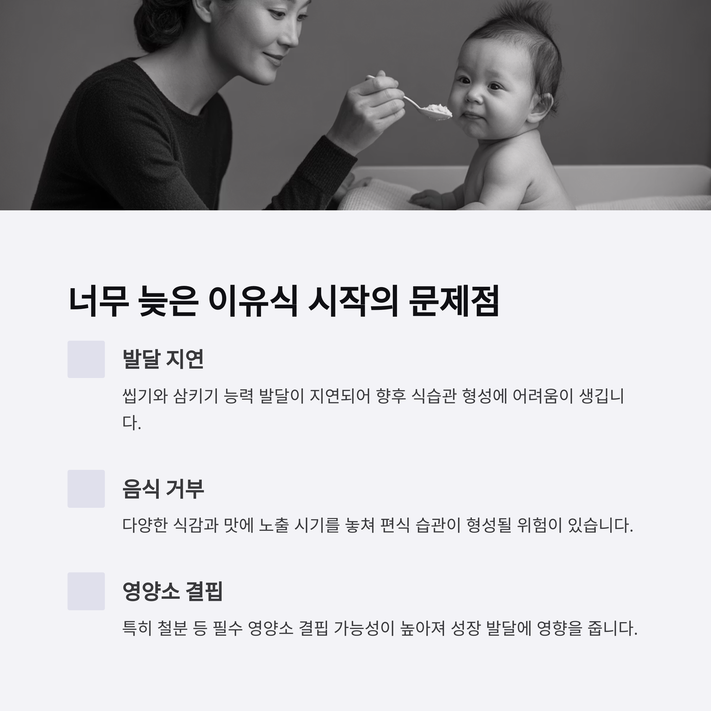 이유식이 너무 늦어지면 음식 거부감, 영양 불균형, 씹기·삼키기 기능 발달 지연 등이 나타날 수 있어요. 발달 타이밍을 놓치지 않도록 준비 신호를 놓치지 마세요.