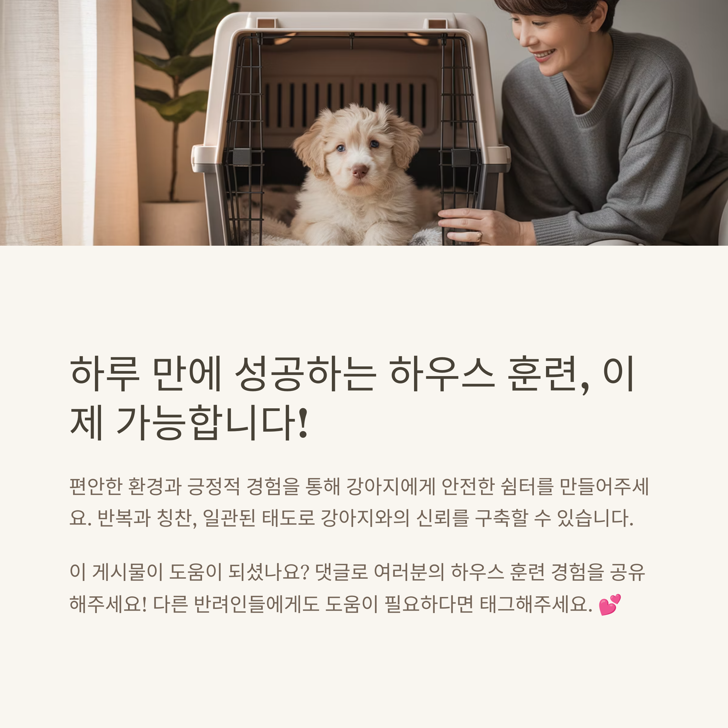 강아지 하우스 훈련 중 어려움이나 궁금한 점이 있으셨나요? 댓글로 여러분의 이야기를 자유롭게 나눠주세요. 함께하는 경험이 또 다른 보호자에게 큰 도움이 될 수 있습니다.